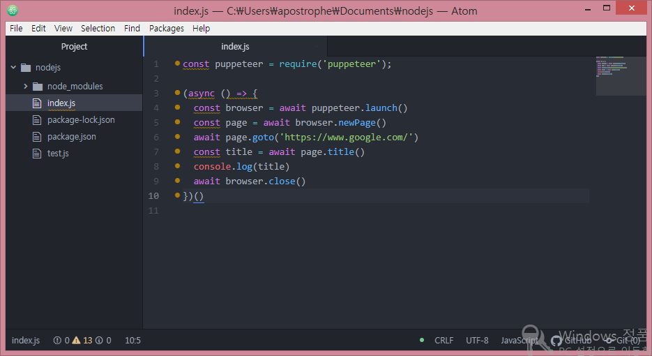 설치하는 사이 아까 만든 index.js 파일에 puppeteer 예제 코드를 삽입합니다.