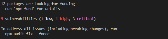 이후에도 아직 경고가 떠서 npm audit fix --force를 실행했다.